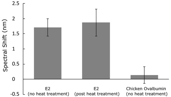 We tested the stability and binding activity of the immobilized E2-binding peptide in the PSi sensor after its exposure to a temperature well above those that might be encountered when sensors are deployed in operational conditions. Here, we repeated the E2 sensing experiments after peptide-modified PSi sensors were subjected to a 90 °C ambient for 2 h. Prior work has shown that anti-E2 antibodies do not maintain high affinity for target E2 protein after being heated at 90 °C for 1 h, while E2-binding peptide retains its binding activity after such a heat treatment; we note that this prior work was conducted using a bead-based Luminex assay and not while the capture agents were immobilized on a nanostructured surface [32]. Figure 6 summarizes the reflectance measurement results of the room temperature and high-temperature E2 sensing experiment. Similar spectral shifts are measured with and without the heat treatment when the peptide-modified PSi sensors are exposed to target E2 protein. Thus, the E2-binding peptide capture agents retain their binding activity in the PSi sensors after exposure to the high temperature. This robustness and stability of the E2-binding peptide makes it a strategic practical choice for the detection of the Chikungunya virus using nanostructured sensor material platforms.