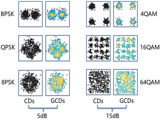 19], received signals were projected into constellation diagrams, and two CNN-based models (i.e., AlexNet and GoogLeNet) were adopted to explore high-level features from the constellation diagrams for further classification. Due to the superior image recognition ability of the CNN networks, classification accuracy in [
