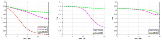 Table 4 lists the average correct classification probability of BPSK, QPSK, and 8PSK at N = 128 and 4QAM, 16QAM, and 64QAM at N = 512 under Gaussian channel, respectively. It shows the classification accuracy of each modulation scheme. It is observed that all the features achieved excellent performance for BPSK and a similar performance for 4QAM. It means that BPSK was classified by all the features when SNR was set from 0 to 20 dB. All the features showed a better classification accuracy for 64QAM than 16QAM when N = 512. Among the different features, FCM showed the worst performance for QPSK, 8PSK, 4QAM, 16QAM, and 64QAM, similar to