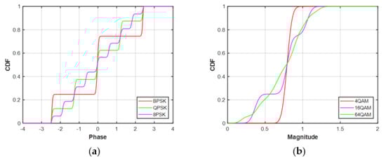 Second, we compared the performance of CCT and K–S classifiers on the feature CDF. CDFs of the MQAM signal at N = 512 under Gaussian channel and non-Gaussian channel are considered in this part. From