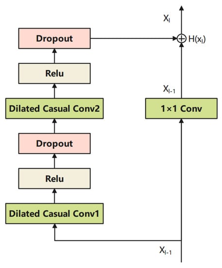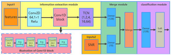 36]. TCN is followed to extract temporal information for more discriminative information to improve the performance of AMC. In the proposed network, the dilated factors of TCN were set to 1, 2, 4, 16, and 64, respectively. The kernel filter size was set to 3. The merging and classification module was used to concatenate the outputs and accomplish the classification.