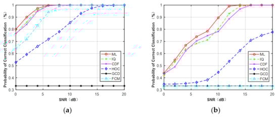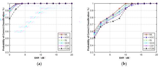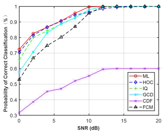 Table 5 lists the overall average probability of correct classification of different features for MPSK and MQAM with signal lengths of N = 128, 256, 512. Like the Gaussian channel, the performance of each feature increased monotonically as the signal length increased. It is seen that the ML classifier provided the best performance for each signal length since the perfect knowledge of the channel and noise variance was already known. For MPSK, the performance of CDF was similar to IQ but better than FCM. When the signal length was short, GCD could not distinguish these two types of signals. For MQAM, the performance of CDF was worse than IQ when N = 128, but it outperformed IQ as the length of the signal increased. Additionally, FCM and GCD are features that are only valid for long signals. The performance of HOC was not satisfactory for both MPSK and MQAM signals.