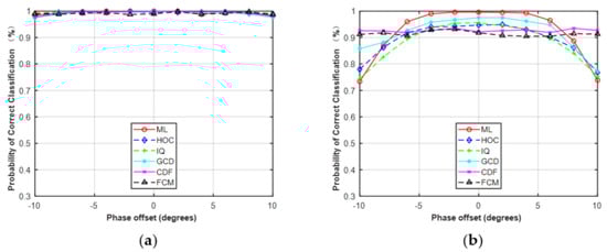 In the first simulation, we only considered the estimation error of phase offset with the assumption that the carrier frequency and SNR were perfectly matched. The range of phase offset in the simulations was set from −10° to 10° with a step size of 2. The classification performance with phase offset is shown in