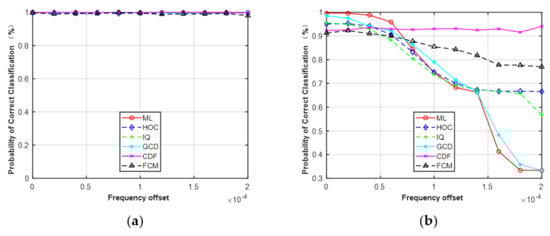 Figure 10, it can be seen that the performance of the five features was robust to the given frequency offset for MPSK. On the contrary, the classification performance of MQAM decreased as frequency offset increased, except for CDF. The reason is the same as the first simulation. When the frequency offset was > 1.6 × 10