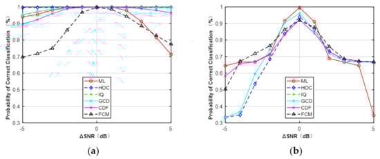 Figure 11, assuming that the range of SNR error was from −5 to 5 dB. It can be observed that features HOC, IQ, GCD, and CDF were less sensitive to SNR errors than FCM and the ML classifier for MPSK. However, for MQAM, all these features were sensitive to SNR errors. To avoid this problem, one feasible approach is to generate more training data with a smaller step size of SNR (e.g., 0.5 dB, 0.2 dB, or 0.1 dB), but at the expense of the overall training time.