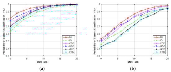 Figure 7a,b depicts the curves of the correct probability versus SNR for MPSK and MQAM when N = 512. It can be observed that, compared with the CCT classifier on the five features: HOC, IQ, GCD, CDF, and FCM, ML provided the optimal performance. However, experiments showed the AMC algorithm based on features and deep learning was faster than the ML classifier. It can be expected that the ML classifier assumed that the knowledge of the channel was fully known, which will consume more time. In addition, for each feature (N = 512), MPSK signals were identified without any error when SNR > 4 dB but for MQAM signals when SNR > 16 dB.