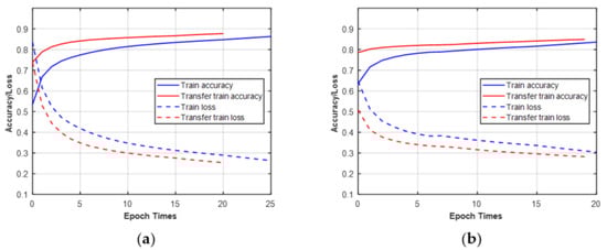 Figure 14, the ascent speed of transfer accuracy and descent speed of transfer loss were faster than the original training when the transfer learning was performed between different modulation scheme sets or channel conditions. In addition, although transfer learning helps to improve training efficiency, it cannot improve classification performance.