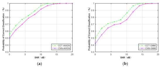 Figure 15, it is obvious that the CCT classifier provided better performance versus each SNR at N = 512 compared with the CNN classifier. The average performance difference between CCT and CNN classifiers was about 3.4% under the Gaussian channel and 5.1% under the non-Gaussian channel.