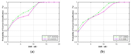Figure 16, it can be seen that the CCT classifier provided better performance than the K–S classifier when N = 512. The average performance difference between CCT and K–S classifiers was approximately 2.1% under the Gaussian channel and 2.7% under the non-Gaussian channel.