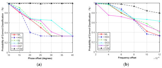 Figure 10, the performance of the five features was robust to the given phase offset and frequency offset for MPSK. Here, we increased the estimation errors to evaluate the effect on classification performance. The phase offset was set to 10°–40° and the frequency offset was set to 2 × 10