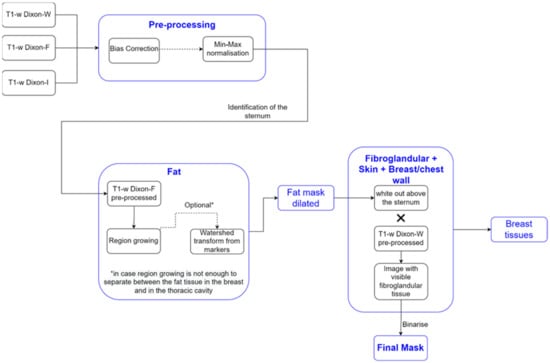 We detail the segmentation methodology used for the different breast tissues in this section. Figure 1 represents a simplified schematic of the steps followed to obtain a mask of the breast region.