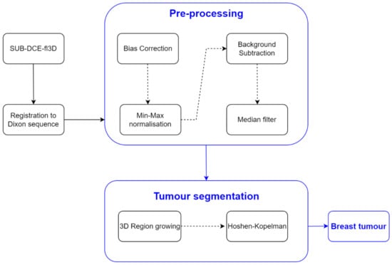 Oftentimes, the 3D region growing algorithm was unable to segment the tumour exclusively, especially for heterogenous tumours with a wide range of voxels’ intensities. Instead, other body tissues were included in the growing region. Hence, in order to segment only the tumour, the Hoshen-Kopelman algorithm was applied [] to retrieve the largest connected component. A schematic of the methodology used for breast tumour segmentation is shown in Figure 2.