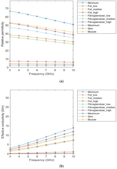 Relative permittivity (a) and effective conductivity (b) curves of non-tumorous tissues adapted from [,] for the frequency range of 3–10GHz.