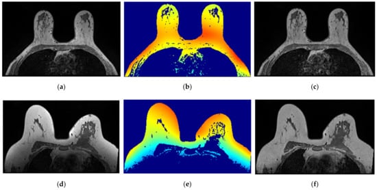 The organs inside the thoracic cavity, such as the heart, lungs, stomach, and liver, presented low-intensity values compared with the high-intensity values of the fat tissues in the T1-w Dixon-F image. Hence, we used these images to exclude them from the breast region mask.