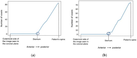 As our methodology uses the sternum coordinates as reference, areas where a tumour invades the pectoralis muscle are not included in the breast region mask. An invasive tumour introduces an asymmetry in the breast; hence, the obtained breast mask and its flipped image (flipped along the sagittal plane) are evaluated. We chose the mean-squared error (MSE) metric (Equation (3)) to evaluate the differences between the mask and its flipped image: