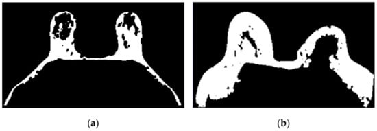 Accurate breast tissue segmentation is of paramount importance to obtain anatomically realistic numerical and physical breast models. Most tissue segmentation algorithms rely on the discontinuity or similarity properties of the image’s intensity values [,]. Several processing pipelines have been developed to identify the different tissues of the breast and use a combination of both properties to achieve a correct segmentation. Discontinuity-based approaches for breast tissue segmentation rely on the identification of air-breast and breast-chest wall boundaries [,], while similarity-based techniques mostly rely on thresholding [], region-growing [], and clustering [,]. Energy-based approaches, such as active contour, have also been proposed to segment the skin of the breast [].