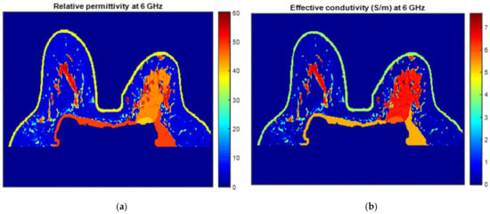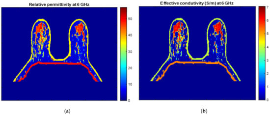 Table 3 contains single-pole Debye parameters (permittivity at high frequency—, the difference between static permittivity and permittivity at high frequency—, relaxation time—, and static conductivity—) of the dielectric curves for each tissue type [,].  As reported in [,], Debye parameters are only valid for frequencies between 3 and 10 GHz. We assumed that the breast/chest wall boundary was composed of muscle.