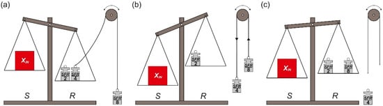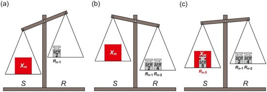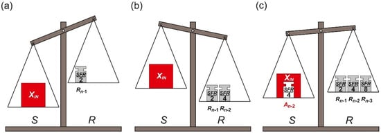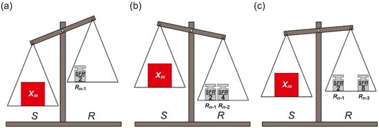 R (Equation (2)). There is no necessity of performing any additional mathematical operations. In the FSMSA it can be evaluated as the difference between the total weights of the reference elements accumulated on the pans (Equation (3)). However, at the end of every conversion process the value of the elements accumulated on the pan