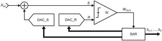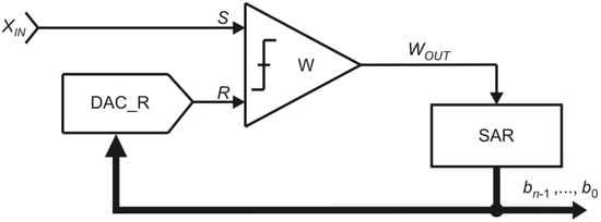 The equivalent of the measured input value XIN is represented by the n-bit digital output word bn−1, …, b0. At the i-th step of the conversion process, for i = 2, 3, …, n + 1 (except the first step), one bit bi is evaluated, starting from the most significant bit bn−1. If the reference signal R is not greater than the source signal S, the bit bn−i + 1 is set to logic “1”. Otherwise, the bit bn−i + 1 is set to logic “0”.