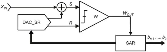 Figure 10. It consists of: one comparator W, one digital-to-analog converter DAC_SR with two outputs and a control logic block SAR. Similarly to the previous SA algorithms, the inputs