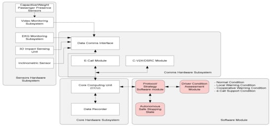 - Core Hardware Subsystem (CrHS)—ensures the processing of all information and ensures analysis of normal and abnormal conditions of the vehicle and its occupants. It must be enabled with local storage of information in a loop, and in case of an impact detection, with the possibility of storing acquired data of the last few seconds and ability to transmit local imaging, position of vehicle after impact, and other recorded parameters.
