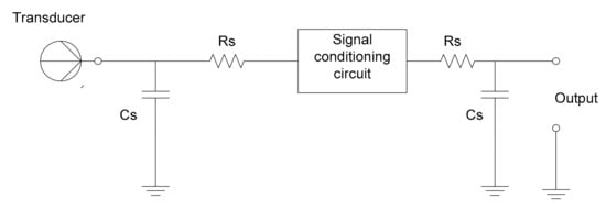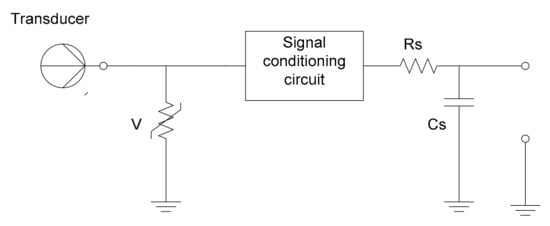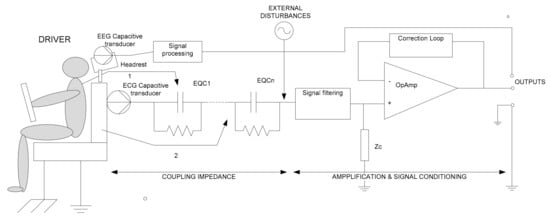 Another important aspect should be the integration of sensors in the vehicle’s equipment without perturbing the normal position or activity of the subject or endangering his/her health due to long exposures to contaminants or radiations. From this point of view, the cECG approach seems to be the most appropriate to be installed in the cabin of a road vehicle. The measurement principle is based on the evaluation of the capacity between two electrodes, in between which the human body represents the electrolyte. From the technological point of view, compared to direct contact, resistive measurement-based methods, the evaluation of the signals produced by capacitive measurements need amplification as close as possible to the coupling surface. The electronic equivalent diagram of the measuring principle is presented in Figure 2 below.