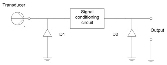For permanent protection of the input circuitry of the measurement system against electrostatic discharges (ESD), different solutions might include diodes connecting to the ground, capacitive circuitry, etc., but these measures should be calculated in such a way that they do not affect the high frequencies of the useful signal and, therefore, the accuracy of determining the heart rate and other significant health parameters (Figure 3, Figure 4, Figure 5).