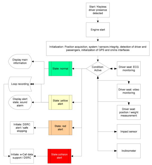 We consider that the present research might be helpful in the enhancement of safety data exchange. The advantage of this proposal is that it integrates different technologies in a non-intrusive package, allowing for a permanent observation of the conscious and health-related state for the person occupying the driver’s seat, with the possibility of extending it to other vehicles’ occupants. Moreover, the application is oriented towards a direct support for e-health services, improving the efficiency in saving human lives in road accidents.