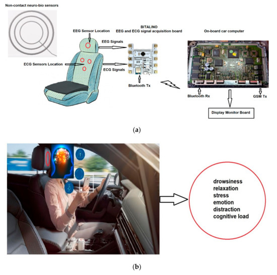 In order to solve problems of interest in academia and research, several prototypes have been developed, with a possible wide applicability in the automotive industry, where the emphasis is on the development of contactless sensors. The sensors were installed in the headrest and the back of the driver’s seat, without the human subject and without the subject being embarrassed in any way. EEG and ECG sensors can detect and collect biomedical signals from a distance of up to 10 cm. Additionally, by analyzing brain waves in addition to highlighting the state of drowsiness that may occur for the driver, the EEG module presented in the article is also able to detect the cognitive states of the driver/passengers, such as relaxation, emotion, stress and inattention. An interface for observing and managing data on multiple IoT devices has also been designed. The test results showed a detection rate for the analysis of cognitive states of 96.75%.