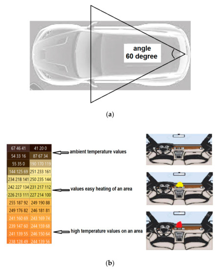 Figure 19b shows the transition of pixel values for ambient temperature (black), values after a slight warming (yellow), and high flame temperatures (orange). When heating, overheating, or flame temperatures are detected, the MEMS network sends alerts on board the vehicle and on the internet to the data center.