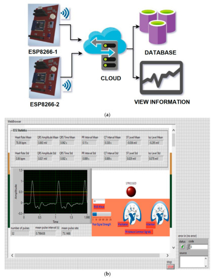 In order to be able to view and store the data received from the IoT sensor nodes, several existing options were researched. The problems that needed to be solved were the visualization of the data from each sensor node on a map, the storage of data in the cloud for its analysis, the alert signaling of possible real-time events, and the visualization of information received from sensors using the cloud, while also pursuing the security of communications. Several options on the market that offer solutions for managing devices connected to the internet have been studied and some of them have been chosen for extensive analysis. The exclusive use of online platforms without the use of local servers for better data management and security was considered. Some of the important information that needs to be viewed in real time is location data, the time the data were sent, and sensor information. Solutions were also sought for sending alerts on a smartphone device in case of possible dangers. The system needs a node with two ESP8266 microcontrollers mounted inside an autonomous vehicle, one of them for monitoring the temperature levels of surfaces or people in the passenger compartment. It needs also to alert, using the application installed on the smartphone, the user of the presence of people or animals inside, which may be in an alert situation due to an excessive temperature in the passenger compartment or by monitoring the cognitive condition and heart rate of the passengers in the vehicle. The second ESP8266 microcontroller present in the passenger compartment needs to take care of collecting data from the sensors and transmit it to the cloud to be analyzed and viewed in real time (Figure 20a).