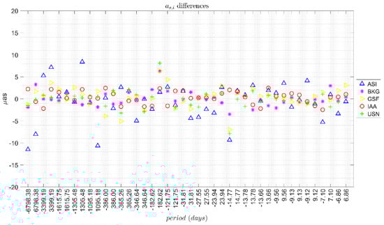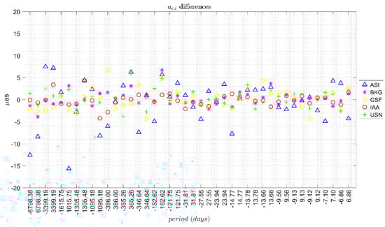 In general, the differences were in a band of ±5 μas for all the periods, except for the ASI solution which showed a more scattered behaviour.