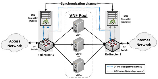 Our proposed solution for the management of transparent clusters is formed by two redirector VNFs, one at each side of the cluster. The reason for placing redirector functions on both sides of the cluster (uplink and downlink directions) is to ensure the bidirectional flow affinity requirement (see Section 4.2.3). Each VNF redirector consists of an OFS and an SDN controller mainly responsible for load-balancing aspects. The SDN controllers work in an active-standby configuration. The active controller replicates the network information to the standby one by using the data distribution service (DDS) method described in [41]. Since the DDS method is based on the publish/subscribe paradigm, the active controller will publish the discovered nodes and configured flows through a data stream also known as a topic. Specifically, the used topic is composed of seven fields: Identifier, NodeId, Port, SourceNode, SourceNodePort, DestinationNode, and DestinationNodePort. Using the identifier field, the active controller announces whether it will send a node or a flow. In the case of the standby controller, it will be subscribed to the used topic, thus receiving the network information. This approach avoids the network discovery phase of the standby controller in the case of a failure in the active controller, thus reducing the service downtime and improving the fault tolerance of the system. The master controller is placed facing the access network to reduce response time, since most traffic requests originate in the uplink direction. The use of two SDN controllers is not strictly necessary, but it is highly recommended to improve the robustness of the solution. Figure 1 provides a general overview of the proposed design as well as the interconnection mode among the solution elements.