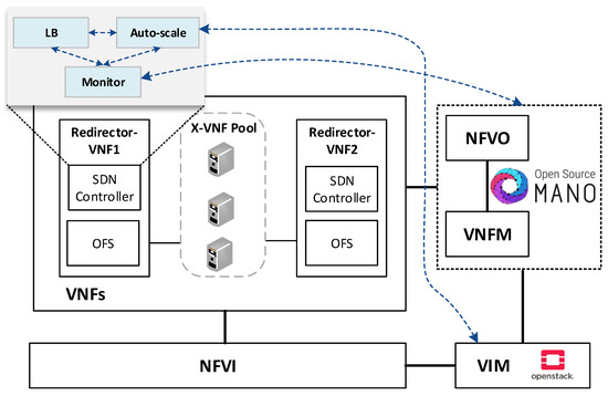 The remainder of this paper is organized as follows. Section 2 introduces some works related to the load balancing and auto-scaling of VNFs. Section 3 gives some background on technologies, such as Open Source MANO and software-defined networking (SDN). In Section 4, a solution is proposed for traffic distribution and the auto-scaling of a cluster of transparent VNFs is presented, and Section 5 validates its effectiveness. Finally, Section 6 concludes our work and presents future work directions.