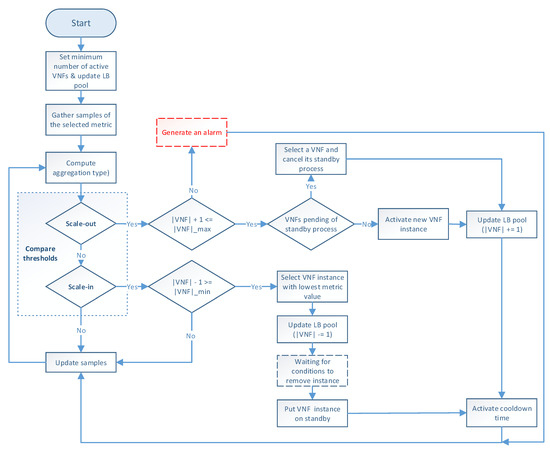 The auto-scaling logic runs during the system lifetime and updates the scaling metric values at each time instance. Figure 3 illustrates the programming logic of the auto-scaling block. It starts by setting the minimum number of active members and exposing this updated information to the LB block. Next, it proceeds to collect samples of the specified metric until completing a threshold time, for which communication with the monitor block is required, and computing its aggregation type with regard to the set of active members in the VNF pool. Afterward, the auto-scaling conditions are verified by comparing the obtained value with the maximum and minimum thresholds. If one of these conditions is met, the effect of its respective scaling action on the number of active instances is verified before proceeding with the activation or deactivation of a VNF instance. The latter helps to maintain the number of active instances between the established values. If the scaling action implies the violation of any of these thresholds, the scaling procedure is discarded, and the system continues gathering samples. Additionally, when the scaling procedure is omitted because the maximum number of active instances has been reached, an alarm can be activated to notify the system administrator that further actions need to be taken. Otherwise, new instances can be started, or existent ones deactivated depending on the triggered condition. According to the VNF service type, a waiting time may be required before putting an active instance on standby to prevent service degradation. In the case of scale-out actions, existing VNFs waiting to change their status to standby are selected instead of activating new ones, thus canceling their associated standby process. After each scaling decision, the set of available VNF instances is reported to the LB. It must be noted that this set is immediately updated for scale-in actions to avoid the assignment of new flows to a VNF instance in a standby process. Finally, a cooldown timer is activated to prevent unnecessary scaling actions caused by possible system instability, and the set of gathered samples is updated.