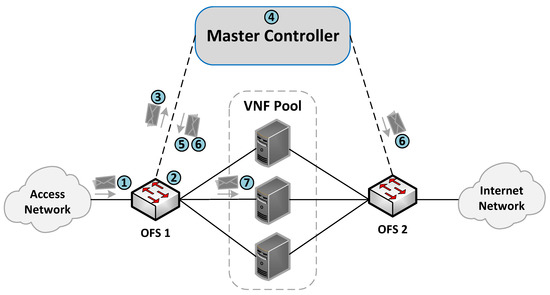 The communication process between the OFSs and the master controller for the flow rules creation is described in Figure 4. More specifically, when an incoming flow arrives at an OFS (step 1), the switch searches in its flow tables the existence of a rule matching the flow (step 2). If there is a match, the switch applies the actions associated with the flow (step 7). Otherwise, the switch sends the packet to its assigned master controller through an OF PACKET_IN message (step 3). The controller is responsible for extracting the header packet information and determining the actions that need to be applied to the flow (step 4).