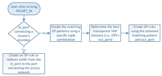 Figure 5 describes the logic executed in the SDN controller when it receives a PACKET_IN message (i.e., step 4 in Figure 4). The controller begins by reading the packet information (e.g., headers and OFS’s in_port), which determines how the flow is processed. At this step, there are two possible options according to the packet’s in_port in the OFS. More specifically, when OFS’s in_port connects with a cluster member, an OF rule is configured to redirect the flow traffic from the cluster member port to the one connecting the access provider network. This rule is created only once during the operation phase unless specified in the idle_timeout field. On the other hand, if the in_port is the one connecting the access provider network, the controller configures actions based on the packet’s header information. In the last case, the load-balancing module creates an OF matching pattern using a specific tuple combination (e.g., source IP, destination IP, protocol, source port, destination port). Several treatments can be defined according to the different tuple combinations and the values of their parameters. For instance, flows matching a given protocol type or source IP can be configured to be processed by a specific cluster member by default. In contrast, other flows may require the selection of an appropriate VNF instance for their processing. Afterward, this module determines the switch’s out_port by selecting the best VNF instance according to the specified load-balancing strategy. Then, the controller creates an OF rule with the selected matching pattern and the obtained out_port. Please note that each transparent VNF instance connects to a specific switch’s port.