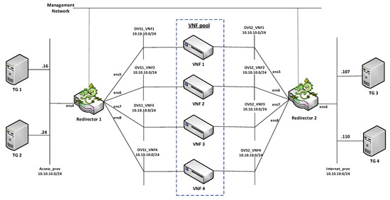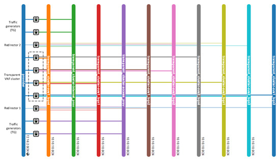 For the validation of the proposed solution, a simplified scenario was considered. The network service consisted of a VNF cluster, two redirector VNFs, four traffic generators (TGs), and one network. The cluster was formed by four generic VNFs that were transparently deployed by configuring their interfaces as a bridge. The TGs’ main function was to inject traffic between the access and data networks. This traffic had to traverse the cluster in a distributed manner. Additionally, subnetting was applied to divide the network domain into smaller subnets. This division allowed each group member to be deployed on a different subnet. It thus ensured that traffic passed only through a single transparent VNF and E2E connectivity between TGs located on different sides of the group. However, adopting the subnetting can introduce several loops in the network when working with BITW VNFS. To account for this, the network service deployment was automated to enable the spanning tree protocol (STP) in the redirectors and transparent VNFs interfaces to avoid network outages due to loops. Once the master controller had taken over the network control, the STP was deactivated to enable interfaces with blocked status. Figure 6 and Figure 7 illustrate the NS topology in a simplified overview and in an OpenStack view, respectively.