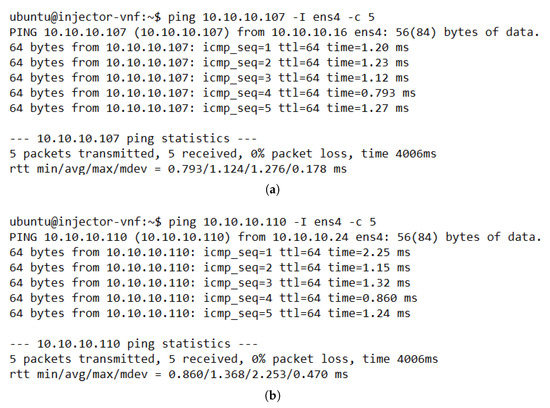 As a proof of concept, we ran several experiments to verify the correct operation of each aspect of the proposed solution. We started by checking the connectivity between the different elements of the system. Figure 8 depicts the results of the ping tests between traffic generators located at different ends (access and internet sides) of the VNF pool. The successful ping execution showed stable E2E traffic through the cluster and low values of time response, which indicates the absence of loops in the network. Moreover, these results showcased that our solution was working as expected since the module related to the flow configuration in the OVSs (i.e., the load-balancing module) configured the required rules to guarantee E2E traffic without losing any packet. Additionally, the ping test also evidenced that the monitoring module had updated information about the active cluster members, as the load-balancing module selected a healthy instance to configure the flows in the switches.