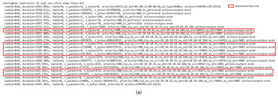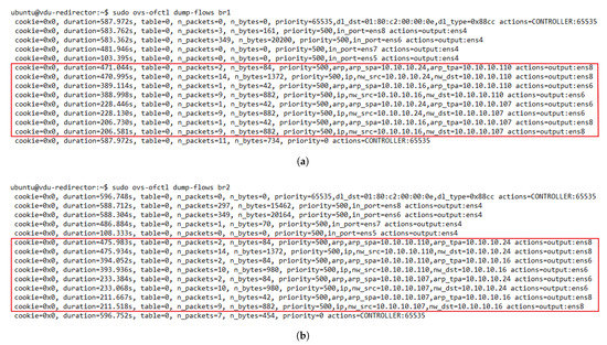 Figure 14 represents the load distribution on each active VNF. Here, the activation of a new VNF instance can be noticed after the failure event. It should also be noted that this new instance had higher CPU utilization than the failed one, as it processed part of the affected traffic along with the newly generated traffic. The latter is evidenced by taking a closer look at the flow rules created in the redirectors (e.g., OFS redirector 1) before and after the failure, see Figure 15a,b, respectively. Comparing both graphs shows that most of the traffic assigned to the failed instance has been redirected to the new VNF (i.e., the flow with the destination port, tp_dst, 5003, 5006, and 5002) along with part of the new incoming traffic (i.e., flow with tp_dst 5009). A small portion of the affected traffic (i.e., flow with tp_dst 5004) was reassigned to the other VNF instance since the new one was not active when the traffic arrived. From Figure 15b, it can also be observed that the flows assigned to the healthy instance (VNF connected in the interface ens6 of the OFSs) maintained their affinity throughout the experiment.