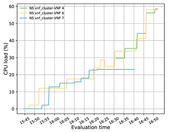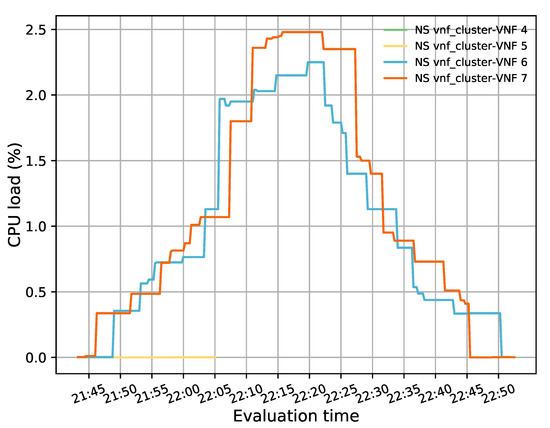 Figure 11 illustrates the evolution of the test over time. For this experiment, minimum and maximum thresholds of 20% and 50% in the average CPU utilization were established to trigger scale-in and scale-out actions, respectively. Additionally, a threshold time of 120 s and a cooldown time of 300 s were considered. During this test, a total of four scaling actions were executed (i.e., two scale-out and two scale-in). At the beginning of the test, there were only two active instances, represented in blue and orange lines, with very low utilization. However, as time passed, the CPU load increased as new packets were injected into the system. At around 22:40 h, the average CPU load was above 50%, triggering a scale-out action. As a result of this procedure, a new instance was activated (green line), and a second instance (yellow line) was also started some minutes later (after 23:00 h) since the average CPU load of the active VNFs once again passed over the maximum established threshold. Due to the granularity used (i.e., 300 s) in OpenStack, the aggregation metric associated with the new instances took some time to be reflected in Grafana. Hence, the starting value of their CPU usage is different from 0% because they were already processing traffic.