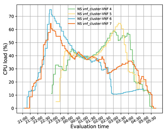 During this experiment, we noticed a reduction in the CPU load of the initially deployed VNFs when new instances were activated even though their allocated flows were invariably maintained. This behavior was due to an increase in system congestion levels caused by the establishment of new connections. To avoid congestive collapse, TCP implements a congestion window (CWND). This mechanism limits the number of outstanding unacknowledged packets that can be in transit on the network for a given pair of source and destination. Specifically, when the network traffic increases, each client that injects TCP packets increases its CWND to reduce its forwarding rate [48]. These reductions are reflected in the CPU load of the BITW VNFs, as the transmission of TCP streams consumes most of the CPU resources [49]. In particular, the newly arrived flows were assigned to the last activated instances as they were the least loaded. Thus, the variation in its CPU load was mainly due to the arrival of new flows and not to the connections already established. In the middle of this test (i.e., 00:30–01:30), the CPU load of the cluster’s members was more balanced, though with slight variations, because the incoming traffic was evenly distributed across all the instances, and had similar utilization levels. However, this behavior did not last too long, and the CPU load of the last activated instance increased while that of the initial VNFs decreased. This reduced the CWND of connections while increasing their send rates, resulting in higher CPU load on scaled instances. The latter was not so noticeable in the first pair of deployed instances due to completing most of its allocated sessions.