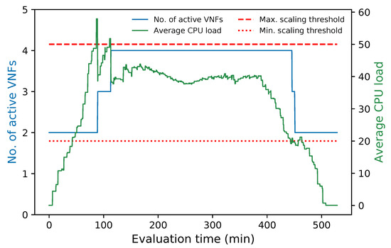 Figure 12 summarizes the aforementioned description. It depicts the variation of the average CPU load in the cluster along with its number of active members during the whole experiment. The figure shows that every time the average CPU was above the maximum threshold (i.e., 50%) a new instance was activated to decrease this parameter. In contrast, at times when the average CPU was below 20%, the number of cluster instances was reduced until the minimum number of active VNFs was reached by the end of the experiment. Additionally, the number of active instances remained constant during the experiment while the average CPU metric was within the established thresholds.