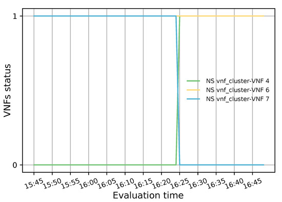 The primary purpose of the health monitoring test was to assess the system’s responsiveness when a member of the transparent VNF cluster fails. To this end, 20 TCP flows were generated with a bandwidth of 20 Mbps, a connection time of 6000 s and a waiting interval of 300 s between each generated flow. Additionally, a low granularity (300 s) was used in OSM and OpenStack to aggregate the collected metrics. This experiment started with two active VNFs to which the incoming TCP traffic was evenly distributed according to their CPU load. After 40 min of the simulation, a failure was emulated in a VNF instance (i.e., VNF with id 7 in the NS) by putting it on standby. This alteration in the selected VNF state can be observed in Figure 13 where the VNF value changed from 1 to 0 just before 16:25 hours (1 means healthy and 0 unhealthy). Additionally, it can be observed that a new instance was activated almost immediately (in less than a minute) to replace the failed VNF and meet the minimum number of active members in the pool.