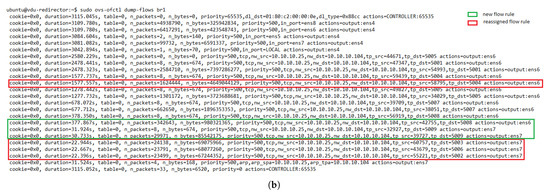 Dynamic flow rule creation in the OFS redirectors with bidirectional flow affinity. (a) Flow table of OFS redirector 1. (b) Flow table of OFS redirector 2.