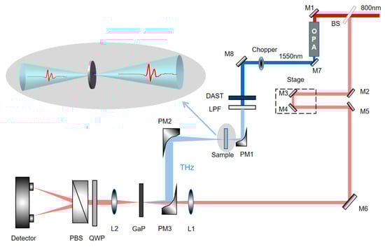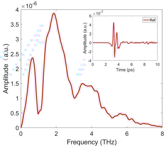 The optical system used in the experiment was a home-built wide-band TDS. As shown in Figure 1, a beam splitter (BS) is used to divide 800 nm femtosecond light into two beams. The choice of BS with a splitting ratio of 98:2 solves the problems of the low main signal strength, low signal-to-noise ratio, and large echo signals caused by the previous BS with a splitting ratio of 90:10. The transmitted beam is used to pump an optical parametric amplifier, and the emitted 1550 nm light is employed to pump a DAST crystal (Qingdao University, Qingdao, China) for THz generation [29,30,31]. The detection crystal is a 200 mm-thick GaP crystal (Chenfang Optoelectronic Technology Co., Ltd, Hebei, China), which ensures that the high frequency of THz radiation can be measured. The THz time-domain signal of the system and its corresponding spectrum are shown in Figure 2. The spectral resolution is 0.1 THz and the signal-to-noise ratio is 849. The resolution of our system is not so high because the detection crystal used in our system is only 200 µm, which makes the required detection time window small and generates corresponding echoes, which eventually lead to a relatively low spectrum resolution. However, due to the relative wide absorption peaks of the samples we used, there are no issues when testing the samples with this resolution. It can be found that the effective spectrum of the system can reach 8.0 THz. The dip around 1.0 THz is caused by the absorption of the DAST crystal. In order to reduce the influence of water vapor, the experiment was conducted in a closed chamber filled with dry air.