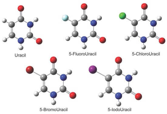 Molecular structures of uracil and 5-substituted-uracils. The 5-substitution atoms are F, Cl, Br, and I, respectively.