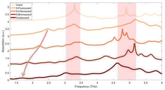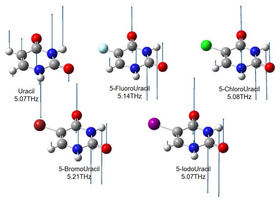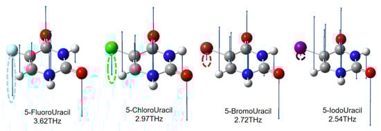 The following are available online at https://www.mdpi.com/article/10.3390/s21248292/s1: Video S1: Dynamic diagrams of Uracil at 5.07 THz; Video S2: Dynamic diagrams of 5-Fluorouracil at 5.14 THz; Video S3: Dynamic diagrams of 5-Chlorouracil at 5.08 THz; Video S4: Dynamic diagrams of 5-Bromouracil at 5.21 THz; Video S5: Dynamic diagrams of 5-Iodouracil at 5.06 THz; Video S6: Dynamic diagrams of 5-Fluorouracil at 3.62 THz; Video S7: Dynamic diagrams of 5-Chlorouracil at 2.97 THz; Video S8: Dynamic diagrams of 5-Bromouracil at 2.73 THz; Video S9: Dynamic diagrams of 5-Iodouracil at 2.53 THz.