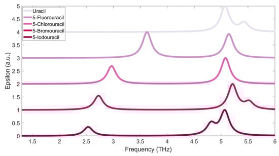 The experimentally measured absorption spectra of the samples are shown in Figure 4. The spectra are shifted perpendicularly for clarity. It can be seen that uracil has two absorption peaks, obviously located around 4.9 and 3.3 THz, and its 5-substituents (i.e., 5-Fluorouracil, 5-Chlorouracil, 5-Bromouracil, and 5-Iodouracil) also have absorption peaks around 4.9 and 3.3 THz. However, in contrast to uracil, the four 5-substituents have another absorption peak below 2.5 THz. Furthermore, it can also be seen that this absorption peak is red-shifted as the relative atomic mass of the 5-substituted atom increases. The absorption peaks near 3.3 and 4.9 THz are caused by the mutual expansion and contraction of the atomic bonds on the pyrimidine ring, and the vibration modes play a key role. When the fifth position of uracil is replaced by a halogen atom, the relative atomic mass of the whole molecule increases, and the position of the center of mass is also shifted relative to uracil. At the same time, the halogen atom interacts with surrounding molecules, resulting in the absorption peaks of 5-substituted-uracils shifting and broadening relative to uracil, at 4.9 THz and 3.3 THz. However, the 5-substituted atoms participate and play a key role in the vibration corresponding to the absorption peak around 2.5 THz. When the relative atomic mass of the 5-substituted atom becomes larger, molecular vibration becomes relatively difficult; therefore, there is a red-shift of the absorption peaks.