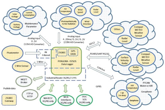 A more detailed description of the adopted system is given in the supplementary material (Figures S1–S4) where we present a description of motherboard (the green square in the Figure 1), SDI-12—serial digital interface, UART—universal asynchronous receiver-transmitter (RS485/UART RS232), 1 Wire, CAN-bus—controller area network, transmission, analog input voltage, GPS, GPRS, ZIGBEE, and power supply.
